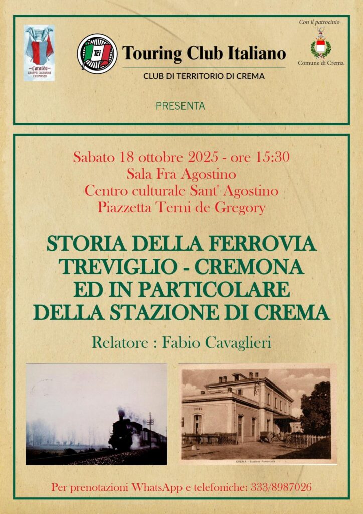 « Tutti gli Eventi STORIA DELLA FERROVIA TREVIGLIO-CREMONA ED IN PARTICOLARE DELLA STAZIONE DI CREMA 18 Ottobre alle 15:30 - 17:30 « CONSUMO DI SUOLO: QUESTIONE DI STILE QUESTIONE DI SCELTE. LA SPADA PERDUTA…prossimamente a Crema, novembre 2025. » + Google Calendar+ Esporta in iCal Dettagli Data: 18 Ottobre Ora: 15:30 - 17:30 Categoria Evento: Araldo Organizzatori ARALDO CREMA T.C.I – CREMA COMUNE DI CREMA Luogo MUSEO CIVICO DI CREMA E DEL CREMASCO, SALA FRATE AGOSTINO Piazzetta W.Terni De Gregory,5 Crema, 26013 Italia + Google Maps